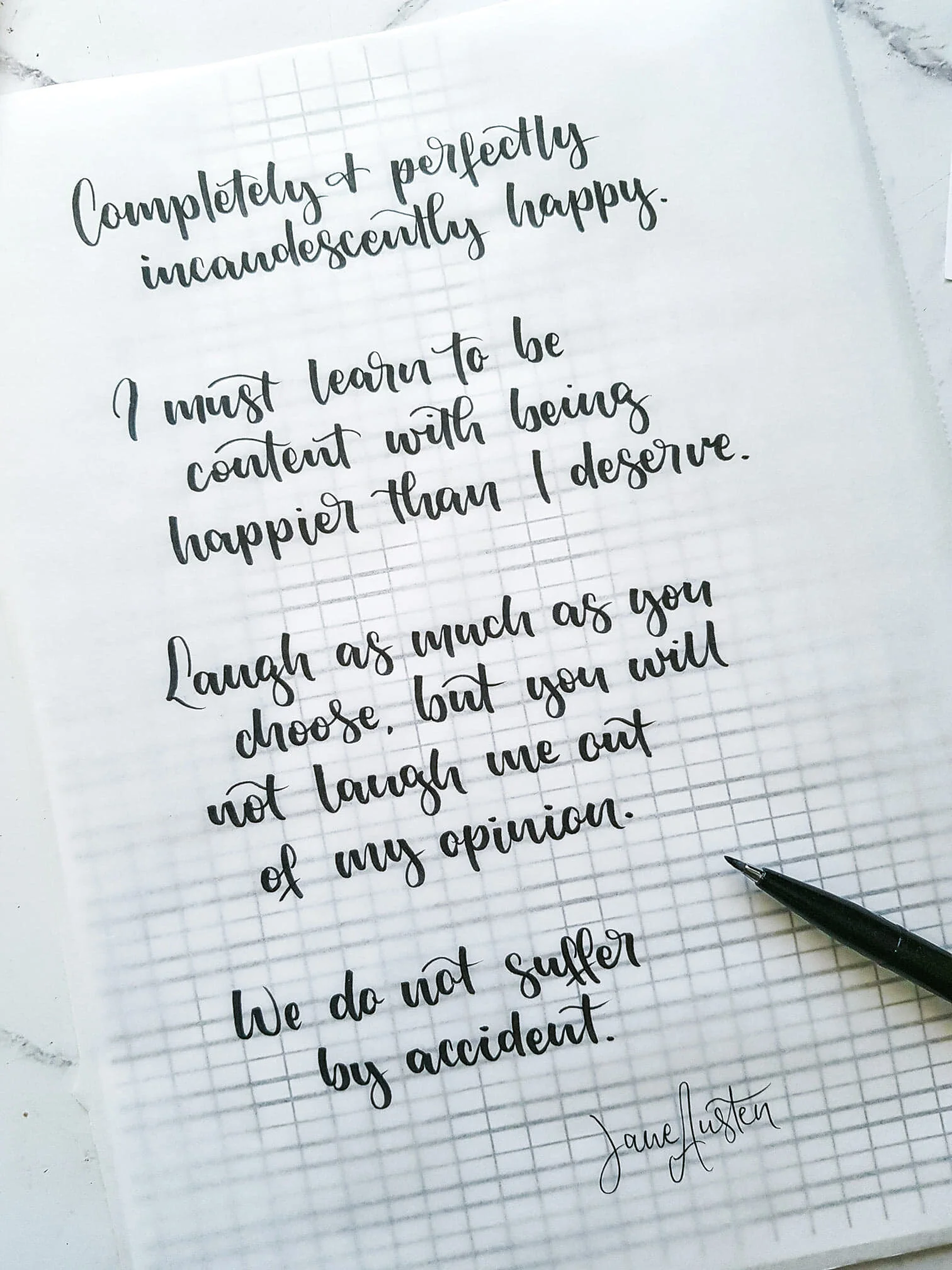 Most beginners start lettering on simple printer paper found lying about the house. Standard weight of printer paper is 80gsm and is thin enough to see thick black guidelines underneath and still hold its own.